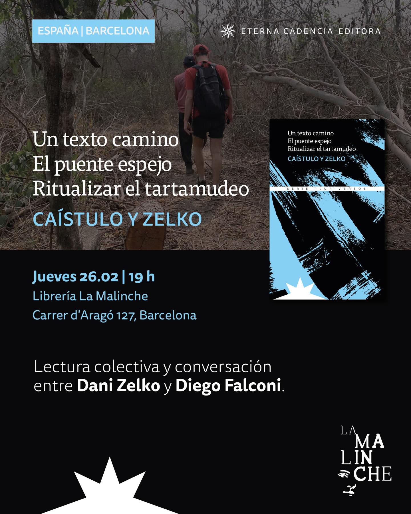 El próximo jueves 26 de febrero, Dani Zelko presentará Un texto camino. El puente espejo. Ritualizar el tartamudeo en La Malinche, en Barcelona. Participará del diálogo y de la presentación Diego Falconi, investigador y ensayista ecuatoriano.